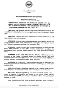The order temporarily reduced the tariff rate for “in quota” importation of frozen pork products from the current 30 percent to 5 percent for the first 3 months and to 10 percent beginning on the fourth month, before reverting back to 30 percent after one year.