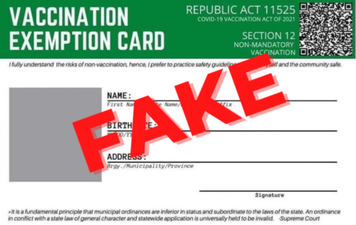 “The so-called exemption cards look similar to the green COVID-19 Vaccination Cards being issued by several LGUs. Sa biglang tingin aakalain itong tunay dahil pareho ng kulay, format at hitsura,” he said.